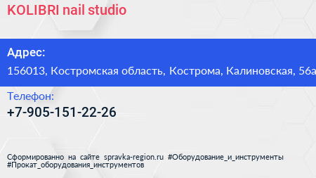 KOLIBRI nail studio по адресу 156013, Костромская область, Кострома, Калиновская, 56а в дальнейшем Организация, размещена в следующих категориях: