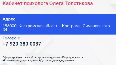 Кабинет психолога Олега Толстикова по адресу 156000, Костромская область, Кострома, Симановского, 34 в дальнейшем Организация, размещена в следующих категориях: