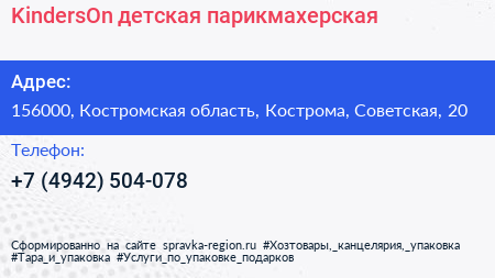 KindersOn, детская парикмахерская по адресу 156000, Костромская область, Кострома, Советская, 20 в дальнейшем Организация, размещена в следующих категориях: