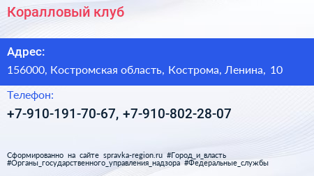 Коралловый клуб по адресу 156000, Костромская область, Кострома, Ленина, 10 в дальнейшем Организация, размещена в следующих категориях: