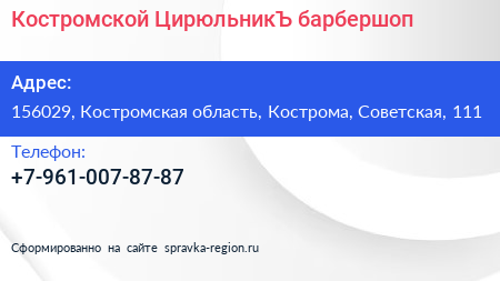 Костромской ЦирюльникЪ, барбершоп по адресу 156029, Костромская область, Кострома, Советская, 111 в дальнейшем Организация, размещена в следующих категориях: