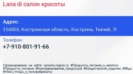 Lana`di, салон красоты по адресу 156003, Костромская область, Кострома, Ткачей, 7г в дальнейшем Организация, размещена в следующих категориях: