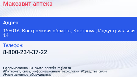 Максавит, аптека по адресу 156016, Костромская область, Кострома, Индустриальная, 14 в дальнейшем Организация, размещена в следующих категориях: