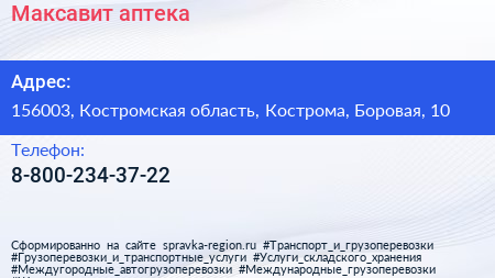 Максавит, аптека по адресу 156003, Костромская область, Кострома, Боровая, 10 в дальнейшем Организация, размещена в следующих категориях: