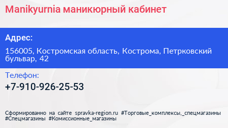 Manikyurnia, маникюрный кабинет по адресу 156005, Костромская область, Кострома, Петрковский бульвар, 42 в дальнейшем Организация, размещена в следующих категориях: