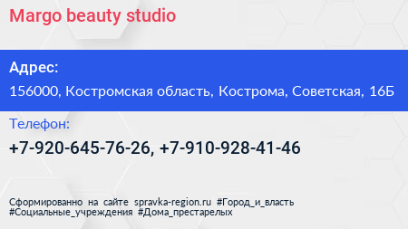 Margo beauty studio по адресу 156000, Костромская область, Кострома, Советская, 16Б в дальнейшем Организация, размещена в следующих категориях: