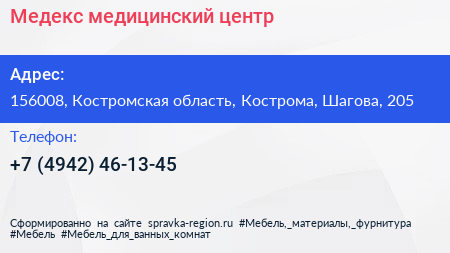 Медекс, медицинский центр по адресу 156008, Костромская область, Кострома, Шагова, 205 в дальнейшем Организация, размещена в следующих категориях: