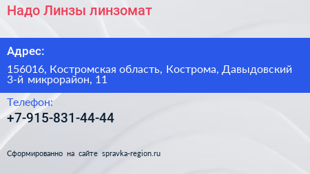 Надо Линзы, линзомат по адресу 156016, Костромская область, Кострома, Давыдовский 3-й микрорайон, 11 в дальнейшем Организация, размещена в следующих категориях: