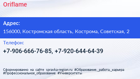 Oriflame по адресу 156000, Костромская область, Кострома, Советская, 2 в дальнейшем Организация, размещена в следующих категориях:
