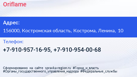 Oriflame по адресу 156000, Костромская область, Кострома, Ленина, 10 в дальнейшем Организация, размещена в следующих категориях: