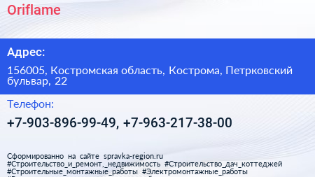 Oriflame по адресу 156005, Костромская область, Кострома, Петрковский бульвар, 22 в дальнейшем Организация, размещена в следующих категориях: