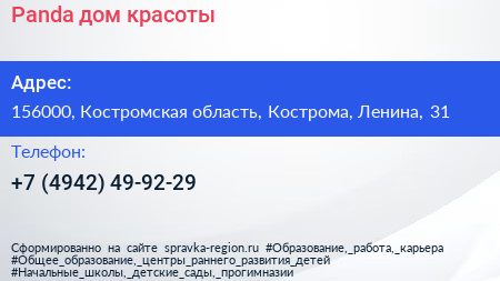 Panda, дом красоты по адресу 156000, Костромская область, Кострома, Ленина, 31 в дальнейшем Организация, размещена в следующих категориях: