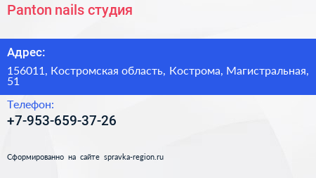 Panton nails, студия по адресу 156011, Костромская область, Кострома, Магистральная, 51 в дальнейшем Организация, размещена в следующих категориях: