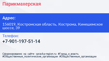 Парикмахерская по адресу 156019, Костромская область, Кострома, Кинешемское шоссе, 39 в дальнейшем Организация, размещена в следующих категориях: