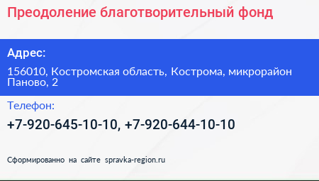 Преодоление, благотворительный фонд по адресу 156010, Костромская область, Кострома, микрорайон Паново, 2 в дальнейшем Организация, размещена в следующих категориях: