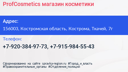 ProfCosmetics, магазин косметики по адресу 156003, Костромская область, Кострома, Ткачей, 7г в дальнейшем Организация, размещена в следующих категориях: