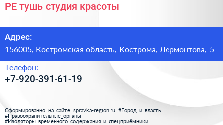 РЕ.тушь, студия красоты по адресу 156005, Костромская область, Кострома, Лермонтова, 5 в дальнейшем Организация, размещена в следующих категориях: