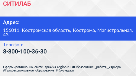 СИТИЛАБ по адресу 156011, Костромская область, Кострома, Магистральная, 43 в дальнейшем Организация, размещена в следующих категориях: