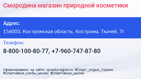 Смородина, магазин природной косметики по адресу 156003, Костромская область, Кострома, Ткачей, 7г в дальнейшем Организация, размещена в следующих категориях: