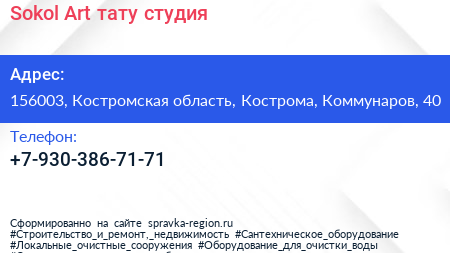 Sokol-Art, тату-студия по адресу 156003, Костромская область, Кострома, Коммунаров, 40 в дальнейшем Организация, размещена в следующих категориях: