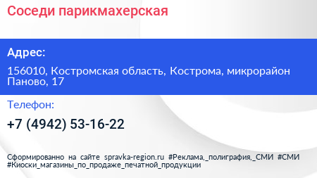Соседи, парикмахерская по адресу 156010, Костромская область, Кострома, микрорайон Паново, 17 в дальнейшем Организация, размещена в следующих категориях: