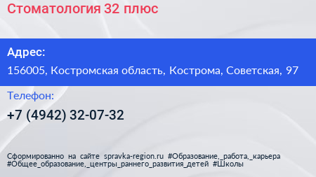 Стоматология 32 плюс по адресу 156005, Костромская область, Кострома, Советская, 97 в дальнейшем Организация, размещена в следующих категориях:
