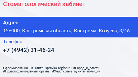 Стоматологический кабинет по адресу 156000, Костромская область, Кострома, Козуева, 3/46 в дальнейшем Организация, размещена в следующих категориях: