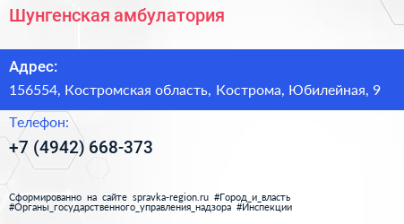 Шунгенская амбулатория по адресу 156554, Костромская область, Кострома, Юбилейная, 9 в дальнейшем Организация, размещена в следующих категориях: