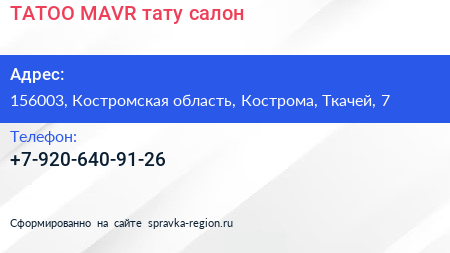 TATOO MAVR, тату-салон по адресу 156003, Костромская область, Кострома, Ткачей, 7 в дальнейшем Организация, размещена в следующих категориях: