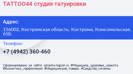 TATTOO44, студия татуировки по адресу 156002, Костромская область, Кострома, Комсомольская, 65Б в дальнейшем Организация, размещена в следующих категориях:
