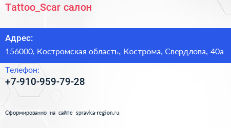 Tattoo_Scar, салон по адресу 156000, Костромская область, Кострома, Свердлова, 40а в дальнейшем Организация, размещена в следующих категориях: