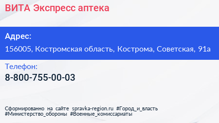 ВИТА Экспресс, аптека по адресу 156005, Костромская область, Кострома, Советская, 91а в дальнейшем Организация, размещена в следующих категориях: