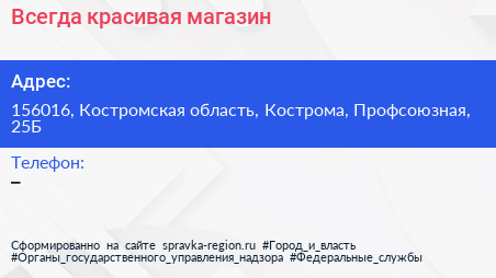 Всегда красивая, магазин по адресу 156016, Костромская область, Кострома, Профсоюзная, 25Б в дальнейшем Организация, размещена в следующих категориях: