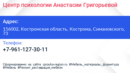 Центр психологии Анастасии Григорьевой по адресу 156002, Костромская область, Кострома, Симановского, 73 в дальнейшем Организация, размещена в следующих категориях: