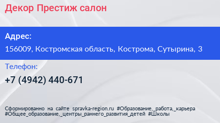 Декор Престиж, салон по адресу 156009, Костромская область, Кострома, Сутырина, 3 в дальнейшем Организация, размещена в следующих категориях: