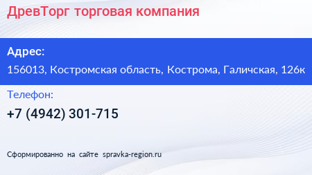 ДревТорг, торговая компания по адресу 156013, Костромская область, Кострома, Галичская, 126к в дальнейшем Организация, размещена в следующих категориях: