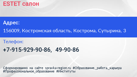 ESTET, салон по адресу 156009, Костромская область, Кострома, Сутырина, 3 в дальнейшем Организация, размещена в следующих категориях: