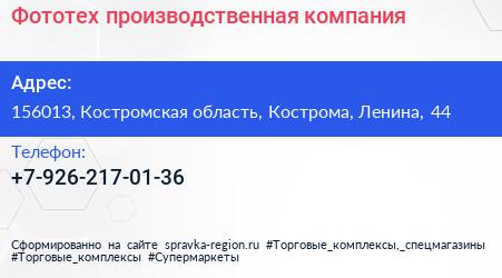 Фототех, производственная компания по адресу 156013, Костромская область, Кострома, Ленина, 44 в дальнейшем Организация, размещена в следующих категориях: