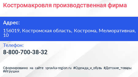Костромакровля, производственная фирма по адресу 156019, Костромская область, Кострома, Мелиоративная, 10 в дальнейшем Организация, размещена в следующих категориях: