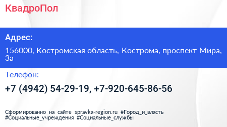 КвадроПол по адресу 156000, Костромская область, Кострома, проспект Мира, 3а в дальнейшем Организация, размещена в следующих категориях: