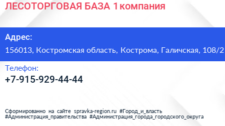 ЛЕСОТОРГОВАЯ БАЗА №1, компания по адресу 156013, Костромская область, Кострома, Галичская, 108/2 в дальнейшем Организация, размещена в следующих категориях: