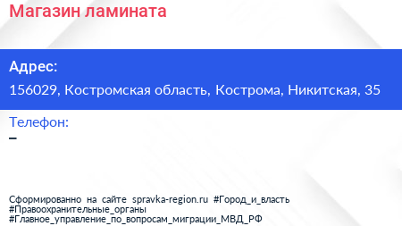 Магазин ламината по адресу 156029, Костромская область, Кострома, Никитская, 35 в дальнейшем Организация, размещена в следующих категориях: