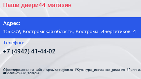 Наши двери44, магазин по адресу 156009, Костромская область, Кострома, Энергетиков, 4 в дальнейшем Организация, размещена в следующих категориях: