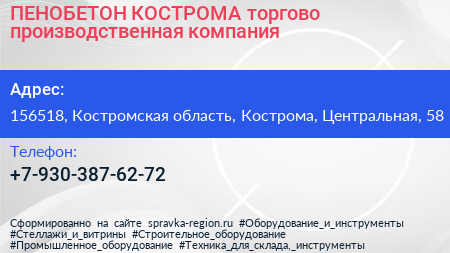 ПЕНОБЕТОН-КОСТРОМА, торгово-производственная компания по адресу 156518, Костромская область, Кострома, Центральная, 58 в дальнейшем Организация, размещена в следующих категориях:
