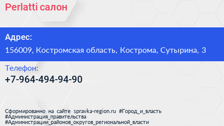 Perlatti, салон по адресу 156009, Костромская область, Кострома, Сутырина, 3 в дальнейшем Организация, размещена в следующих категориях: