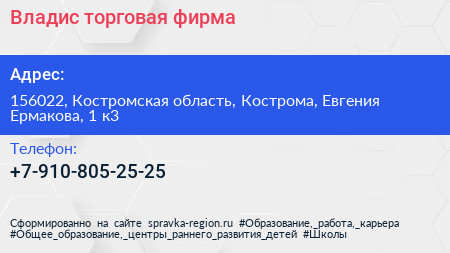 Владис, торговая фирма по адресу 156022, Костромская область, Кострома, Евгения Ермакова, 1 к3 в дальнейшем Организация, размещена в следующих категориях: