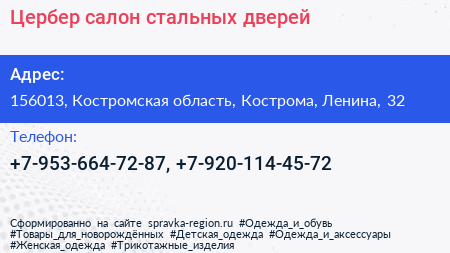 Цербер, салон стальных дверей по адресу 156013, Костромская область, Кострома, Ленина, 32 в дальнейшем Организация, размещена в следующих категориях: