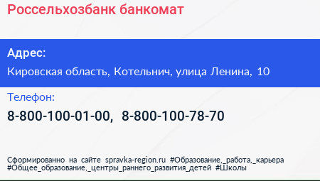 Россельхозбанк, банкомат по адресу Кировская область, Котельнич, улица Ленина, 10 в дальнейшем Организация, размещена в следующих категориях:
