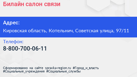 Билайн, салон связи по адресу Кировская область, Котельнич, Советская улица, 97/11 в дальнейшем Организация, размещена в следующих категориях: