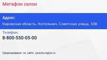 Мегафон, салон по адресу Кировская область, Котельнич, Советская улица, 108 в дальнейшем Организация, размещена в следующих категориях: